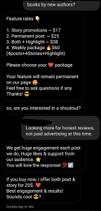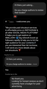 One was strange. I messaged asking if they charged for reviews, and they replied with ‘rates’. I replied I couldn’t afford marketing at the moment, and they offered me cheaper ‘rates’.
