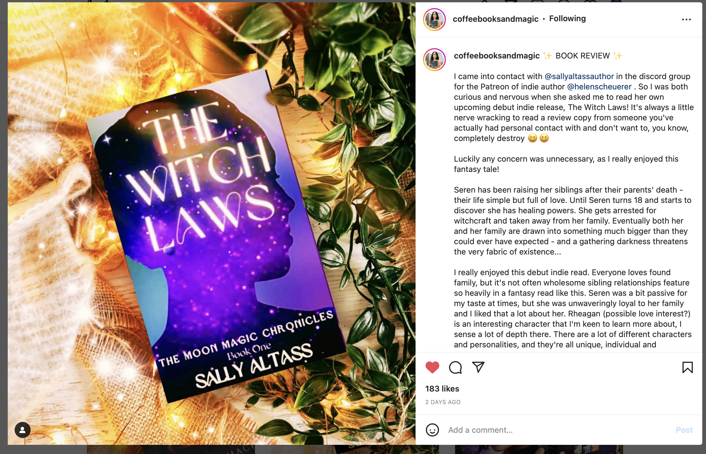 @helenscheuerer . So I was both curious and nervous when she asked me to read her own upcoming debut indie release, The Witch Laws! It’s always a little nerve wracking to read a review copy from someone you’ve actually had personal contact with and don’t want to, you know, completely destroy 😆😆